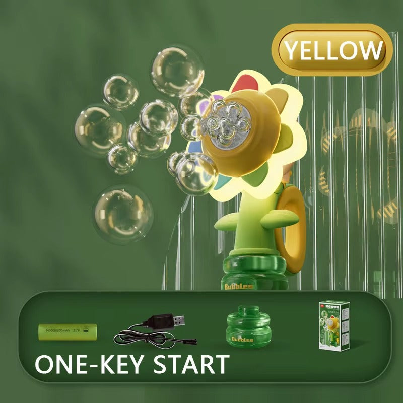 Geformt wie eine fröhliche Blume, lässt dieses Spielzeug Blasen frei, die schweben, funkeln und Kichern hervorrufen. Es ist Sommerzauber in Bewegung.