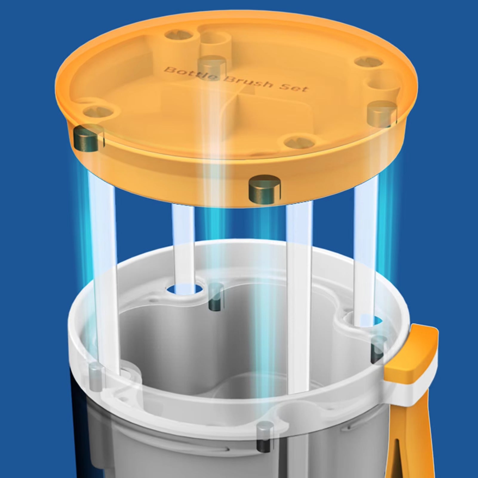 Dieses tragbare Flaschenbürsten-Set enthält einen kompakten Griff, Bürstenköpfe und Werkzeuge, um Flaschen, Sauger und Ventile überall zu reinigen.
