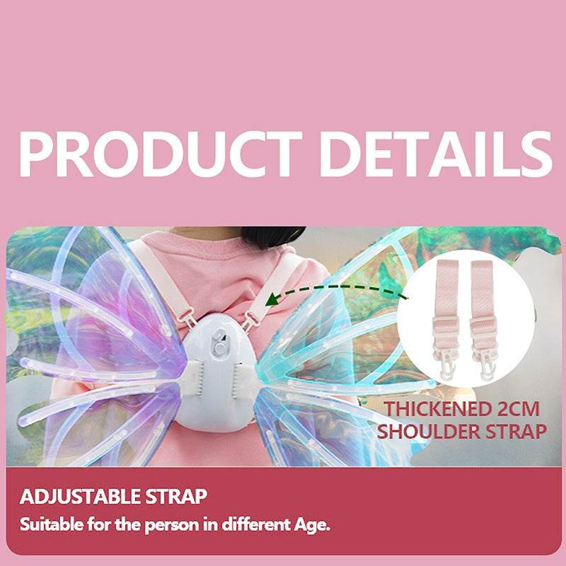 Diese bezaubernden Flügel erwecken die Magie zum Leben mit ihrer interaktiven Bewegung, Lichteffekten und ihrem bequemen Design. Die Flügel bewegen sich anmutig mit den Aktionen Ihres Kindes und bereichern das fantasievolle Spiel und Geschichtenerzählen. LED-Lichter in verschiedenen Farben verleihen einen funkelnden Akzent, der jede Bewegung noch magischer macht. Mit weichen, verstellbaren Riemen entworfen, sorgen sie für einen sicheren und bequemen Sitz für den ganzen Tag. Hergestellt aus leichten, aber dennoch strapazierfähigen Materialien, sind sie sowohl sicher als auch nachhaltig. Um sie zu benutzen, tragen Sie einfach die Flügel, indem Sie die verstellbaren Riemen anbringen, schalten Sie die LED-Lichter ein und bewegen oder tanzen Sie, um die Flügel flattern zu sehen. Lassen Sie die Fantasie Ihres Kindes fliegen, während es magische Geschichten erschafft und aufregende Abenteuer erlebt!