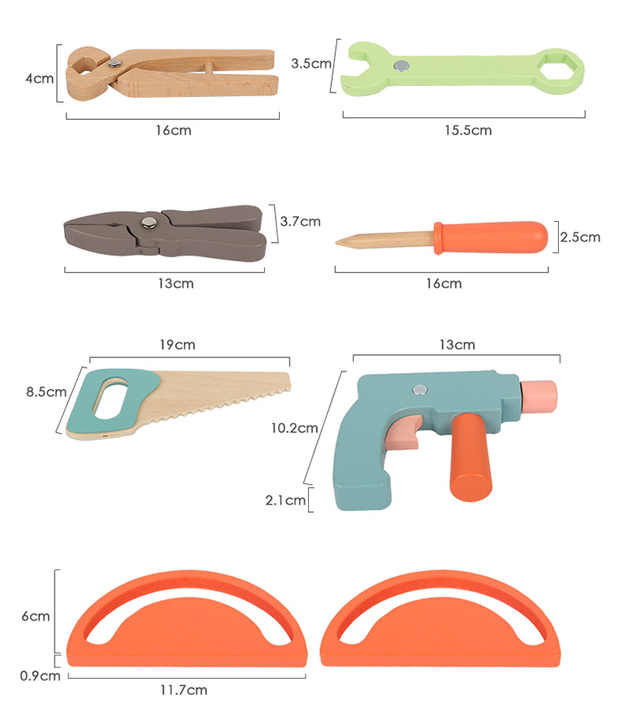 ✓ Set beinhaltet – Holzwerkbank + Hammer, Schraubendreher, Schraubenschlüssel, Schrauben und Zahnräder (insgesamt 11–15 Teile je nach Version)