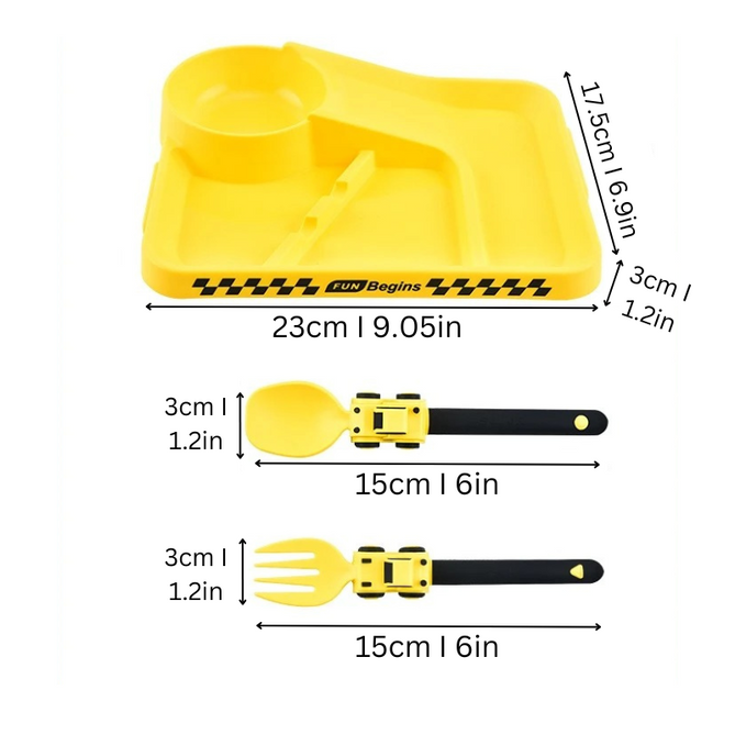 De RaceTafel Set is niet alleen leuk, maar ook veilig en praktisch. Gemaakt van BPA-vrije materialen, biedt het bestek een comfortabele grip voor kleine handjes, en de stevige plaat zorgt voor een stressvrije maaltijdervaring voor zowel kinderen als ouders.