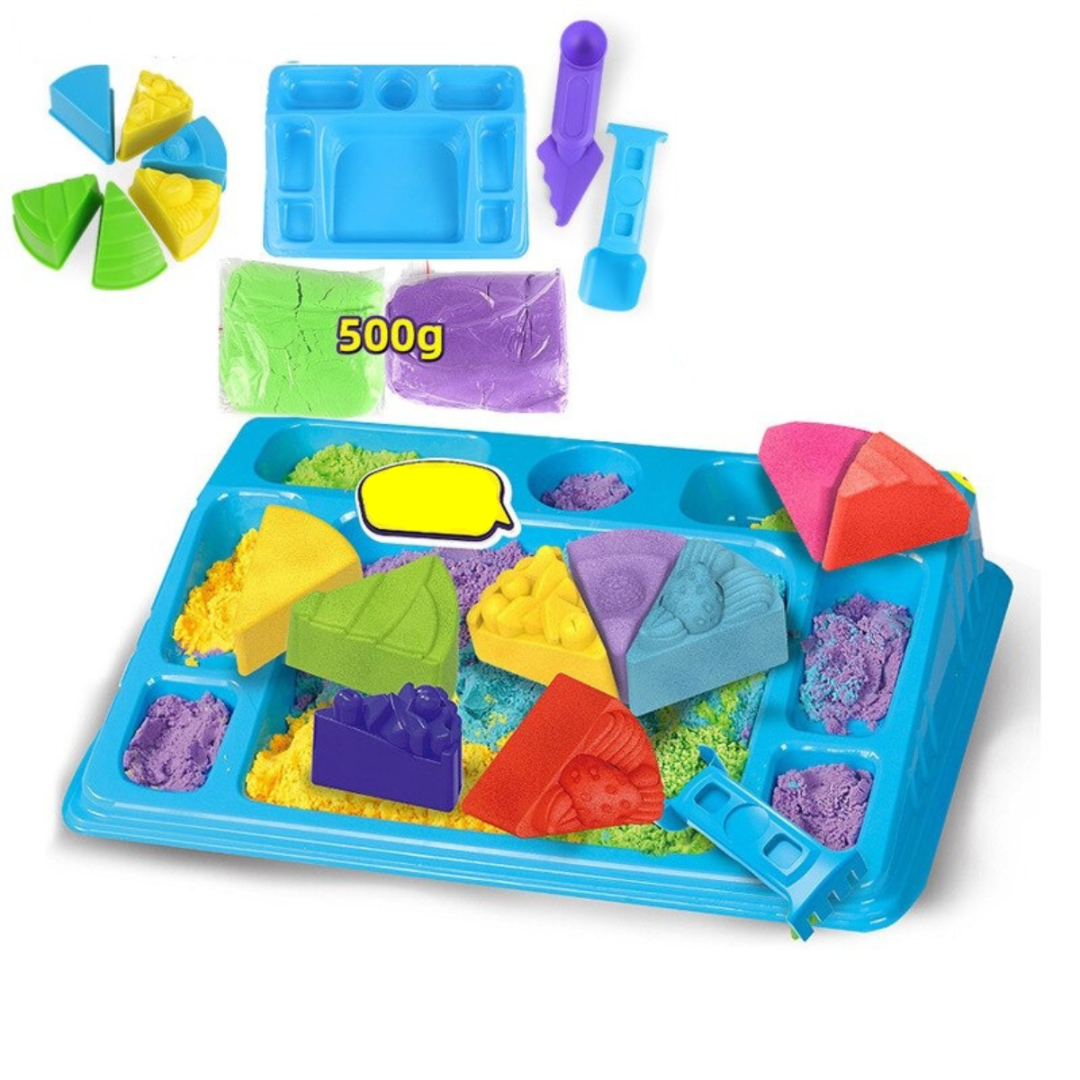 SandSculpt bringt sensorisches Spielen auf ein neues Level! Kinder formen und modellieren bunten Kinetik-Sand mit Dinosaurier-, Kuchen- oder Meeresformen. Das Beste: Kein Schmutz, keine Sauerei – perfekt für Eltern.