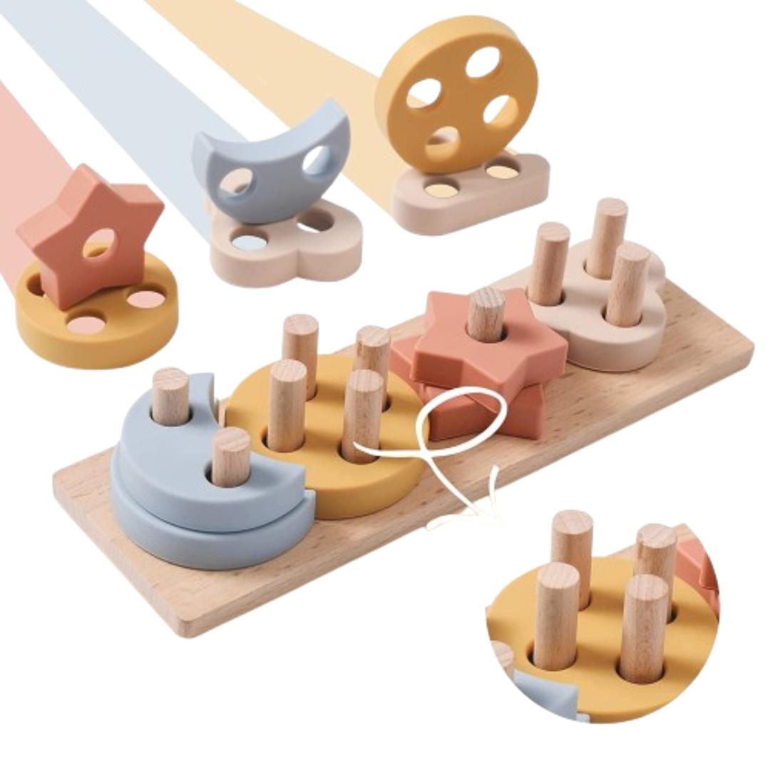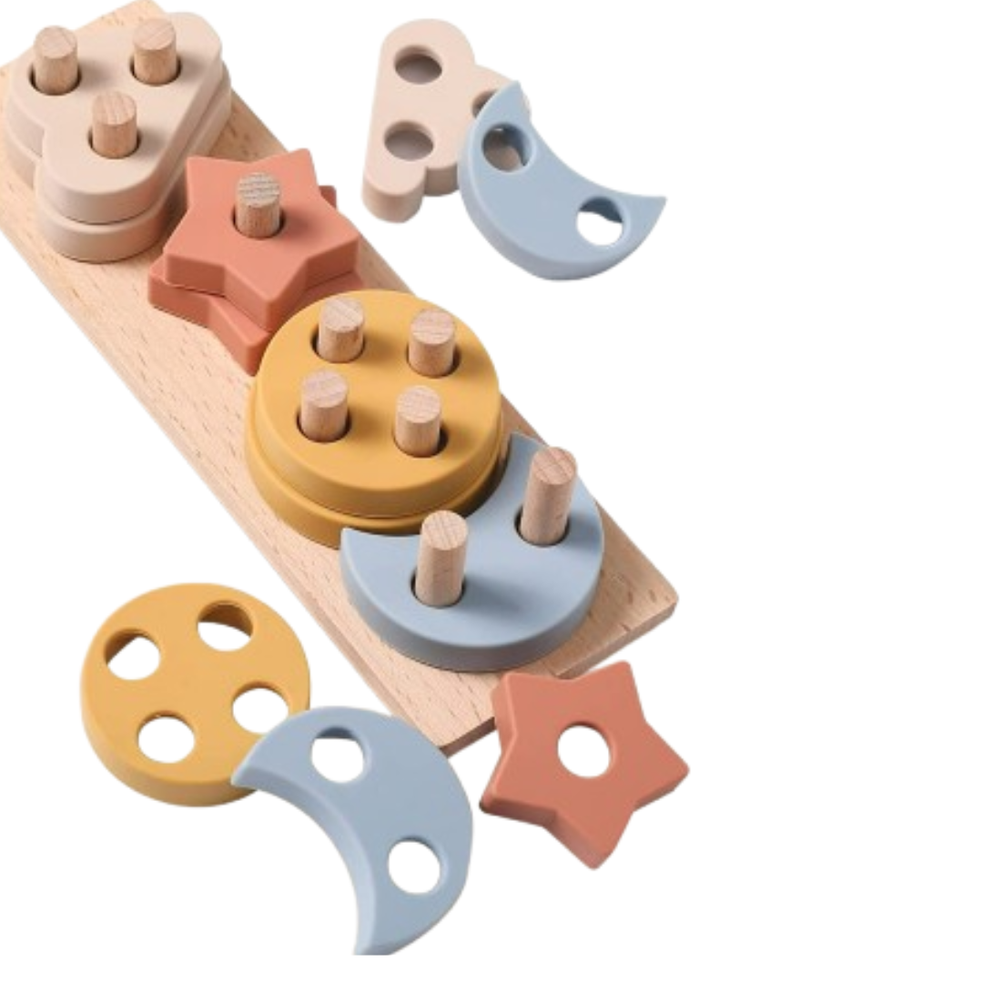 Stellen Sie sich die Freude Ihres Kindes vor, wenn es bunte Holz- und Silikonformen auf ein charmantes Ziehspielzeug stapelt, seine motorischen Fähigkeiten entwickelt und Texturen erkundet. ShapeShuttle ist nicht nur ein Stapelspielzeug; es ist ein Tor zur sensorischen Erkundung, ein Werkzeug zur Verbesserung der Hand-Augen-Koordination und kognitiven Fähigkeiten und eine Quelle endloser pädagogischer Freude. Beobachten Sie, wie sie Formen und Farben erkennen, ihre Feinmotorik verbessern und während des Zahnens Erleichterung finden, während sie gleichzeitig die taktile Erfahrung von Holz und Silikon genießen.