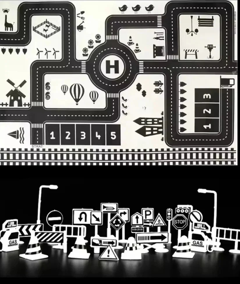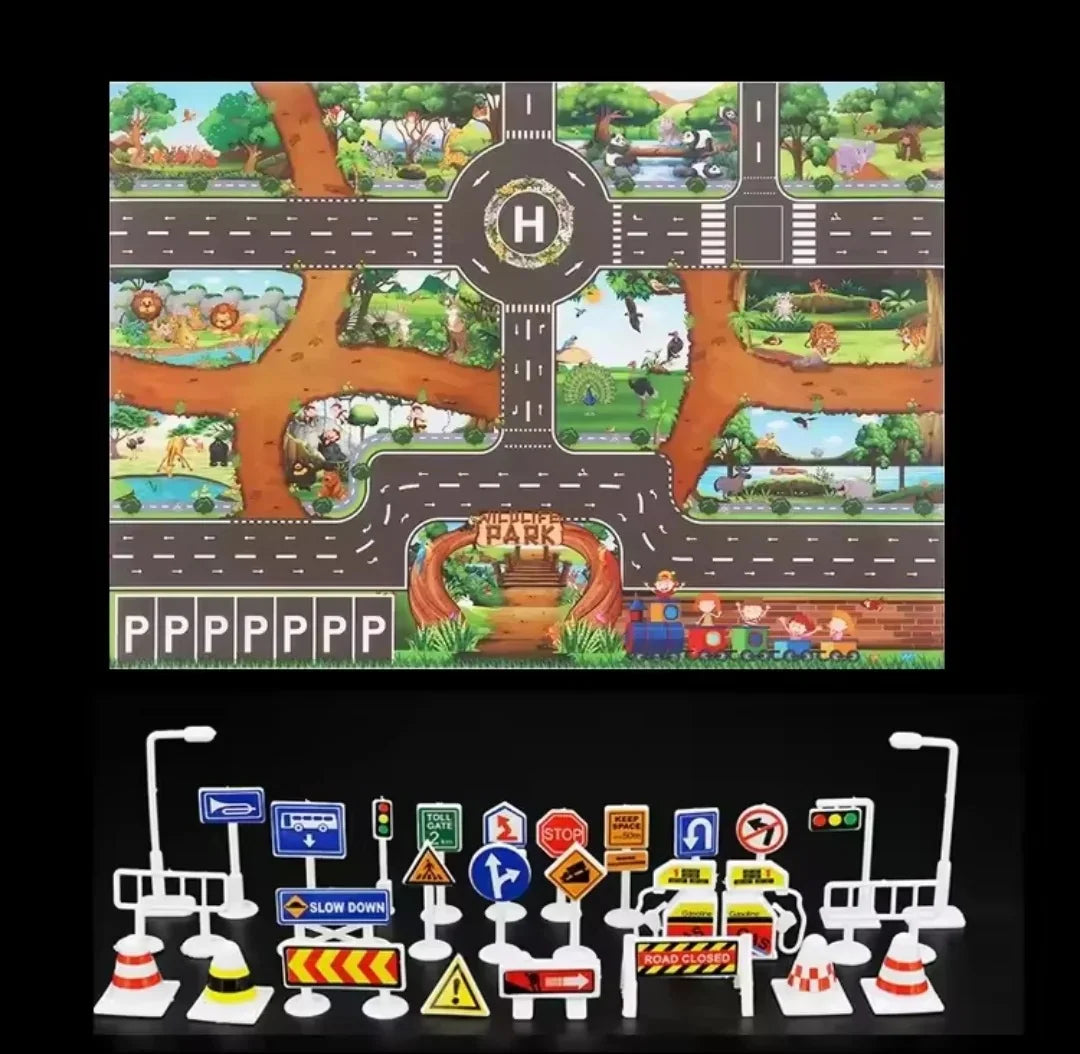 - Set beinhaltet: 1 Spielmatte + 2–3 Spielzeugfahrzeuge